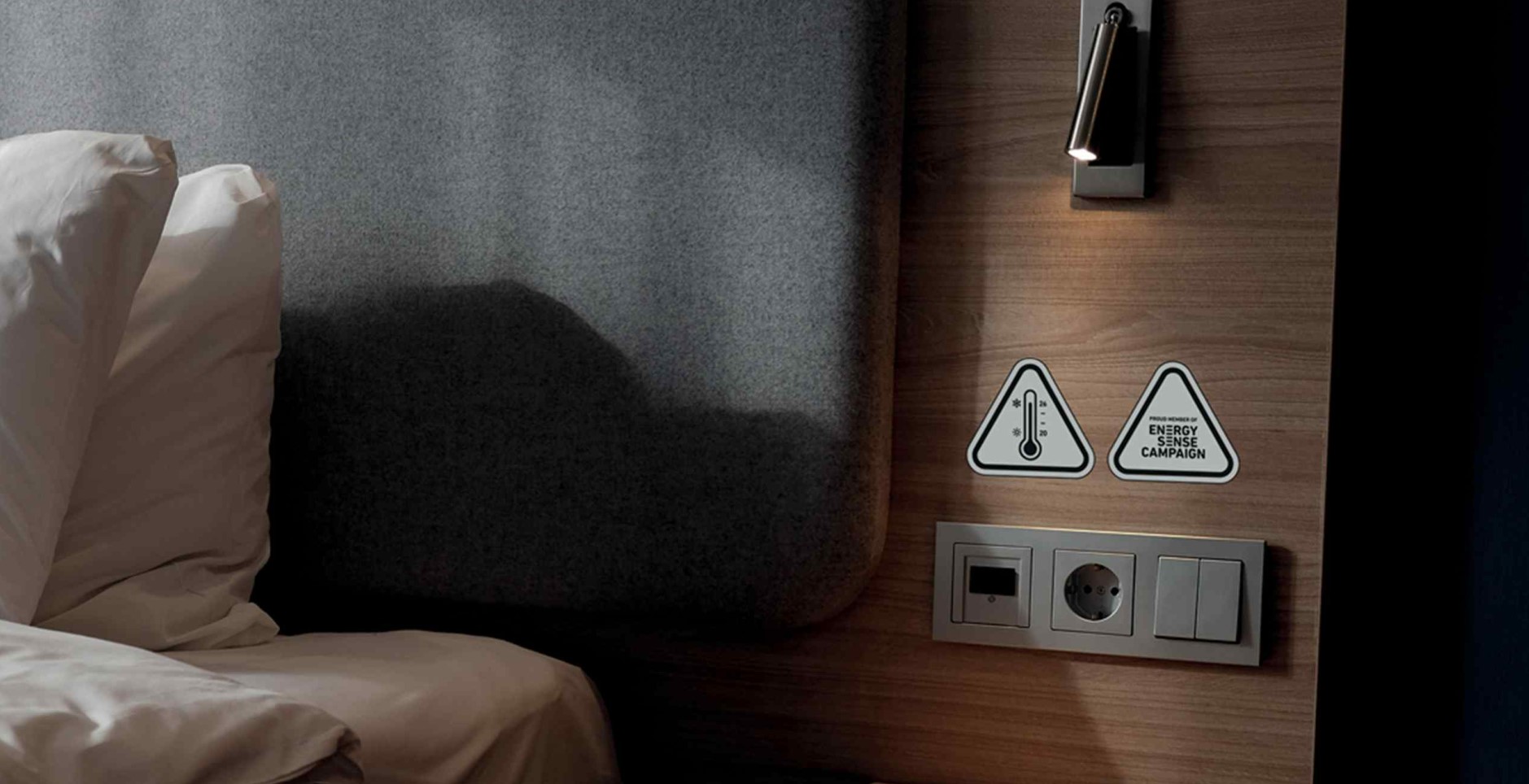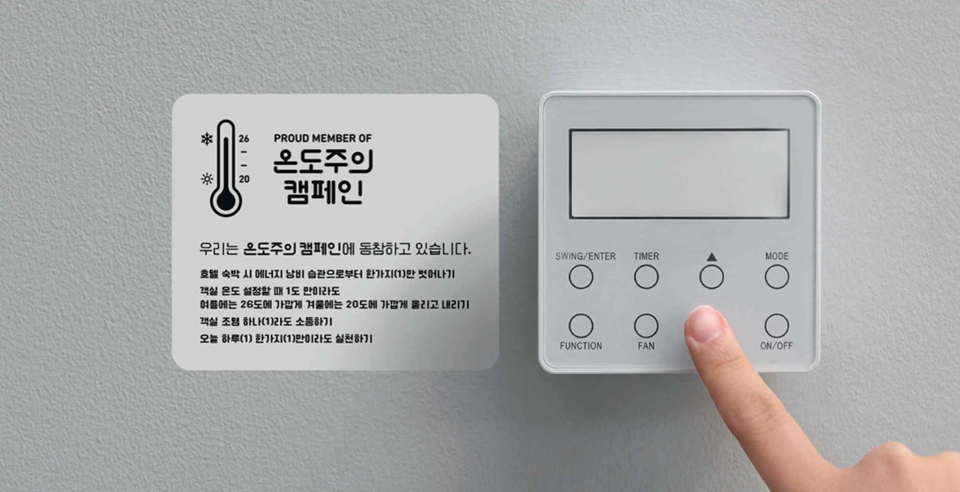 - 거꾸로 온도계 픽토그램 : 온도계 그림 상단에 '냉방 26℃', 하단에 '난방 20℃'를 표기한 '거꾸로 온도계' 픽토그램이다. 사람들에게 에너지 효율에 이상적인 실내 온도를 각인시키고 에너지 절약을 유도하도록 만들었다. 체크인 시 제공되는 카드키에 '거꾸로 온도계' 스티커를 붙여 객실 내 적정 온도를 쉽게 인식하고 유지하도록 유도한다.