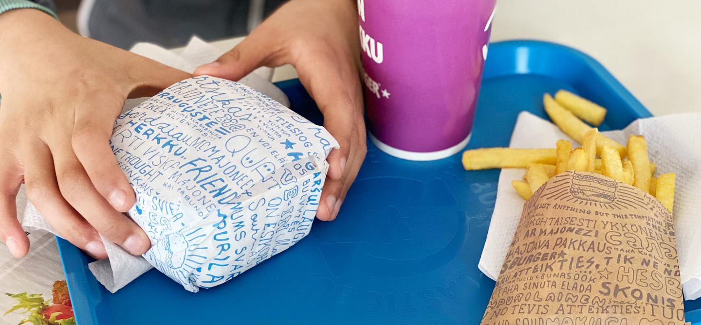 사진: 재활용 소재로 제작한 매장 내 직원용 모자 https://www.touchpointww.com/ajankohtaista/kuljetuslaatikoista-syntyi-19-000-tarjotinta-hesburger-ravintoloihin