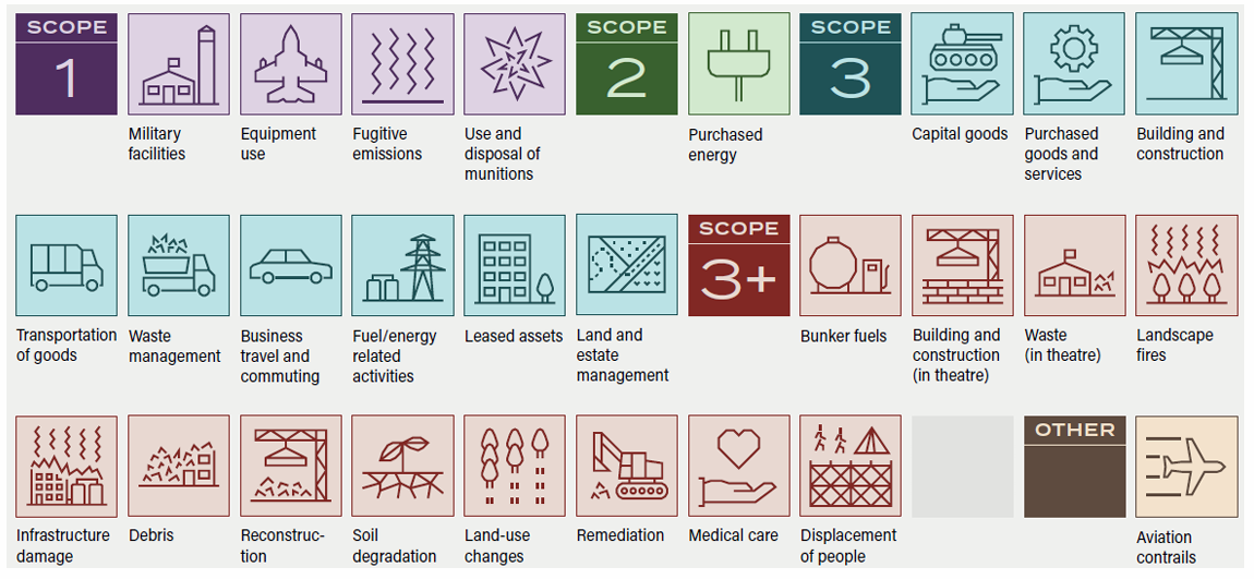 전쟁으로 인한 탄소 배출을 체계적으로 분석하기 위해, CEOBS(Conflict and Environment Observatory)*가 제안한 군사 부문 온실가스 보고 프레임워크를 개념적 틀로 사용합니다. 이 프레임워크는 군사 활동과 관련된 모든 배출원을 포괄적으로 파악하는 데 도움을 주며, 배출원을 다음과 같은 범주로 분류합니다. 이 범주들을 공장 운영에 비유하면 아래와 같습니다.